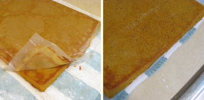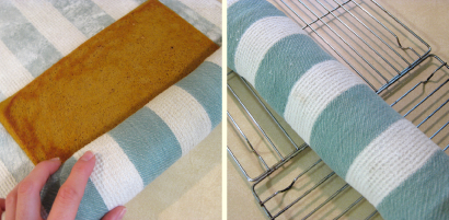 Immediately loosen edges of cake from pan and turn out onto the prepared towel. Remove the wax paper. Position a short side of the cake at the end of the towel.