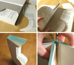 Once complete, cut off the covers, leaving the spine binding in tact. Open the book and fold it backward, gluing together the first and last pages with craft glue or a glue gun. Hold for a few seconds until secure.