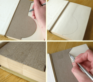 Cut your template shape out of the cardboard and place it onto the first page of the book, snug against the binding. You can trace it with a pencil if you’d like to have a guidline if your template moves, but it’s easiest to cut along the template. I taped mine in place at the top and bottom to hold it secure.