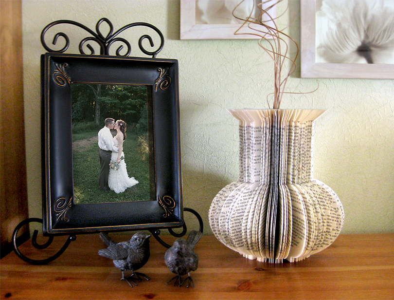 Spread out the pages and you’re done! Since you do end up with a small opening along the spine, you can use this as a ‘vase’ for a silk flower stem or some dried pieces like I show in my opening photo. You can also create a small cluster in different sizes and shapes for a unique arrangement.