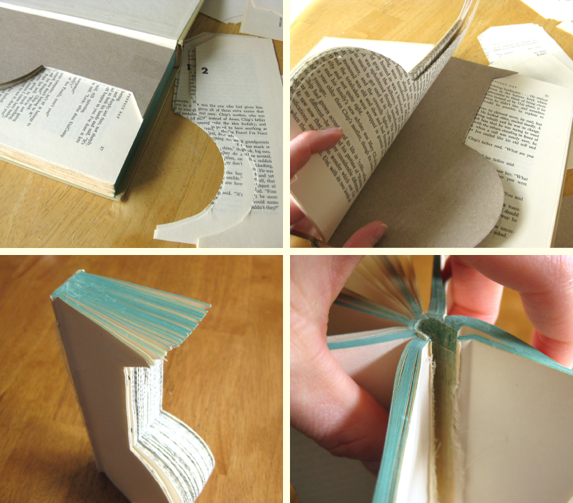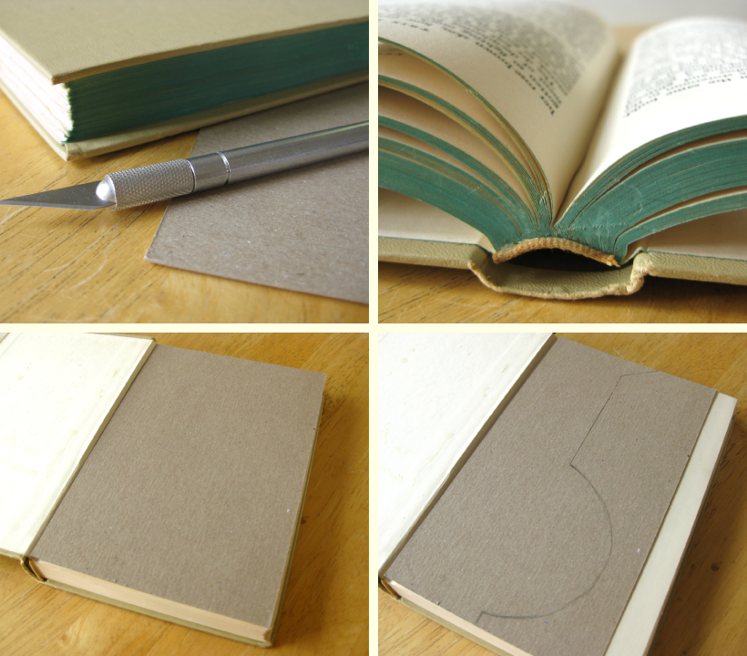Cut your template shape out of the cardboard and place it onto the first page of the book, snug against the binding. You can trace it with a pencil if you’d like to have a guidline if your template moves, but it’s easiest to cut along the template. I taped mine in place at the top and bottom to hold it secure.