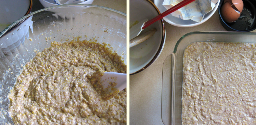 Bake in a greased 8-inch square pan at 425° for 20 minutes or until golden brown on top.