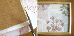 Once the cork is cut, make sure it fits inside the frame. Next choose your fabric. You can decide on placement by using the empty frame as a guide if needed.