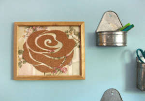 Place it under a stack of phone books or heavy box to dry and flatten out. To hang it on the wall, you can use strong glue to attach small brackets, hooks or wire from a picture hanging kit or you can use double sided adhesive squares made for home decor use. You can also use a small headed nail and press the cork board into it. The piece is very light and as long as you don’t tack anything very heavy to it, any of those options will hold just fine.