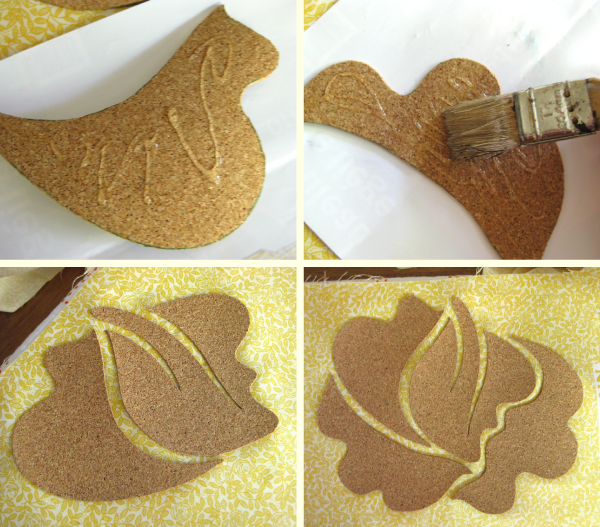 Apply a clear craft glue to the back of each cork piece and use a brush or foam sponge to spread the glue evenly and then apply the pieces to the fabric. Be sure the fabric is smooth and taut as you go. (You can also use scrapbook paper in place of the fabric if you’d like!)