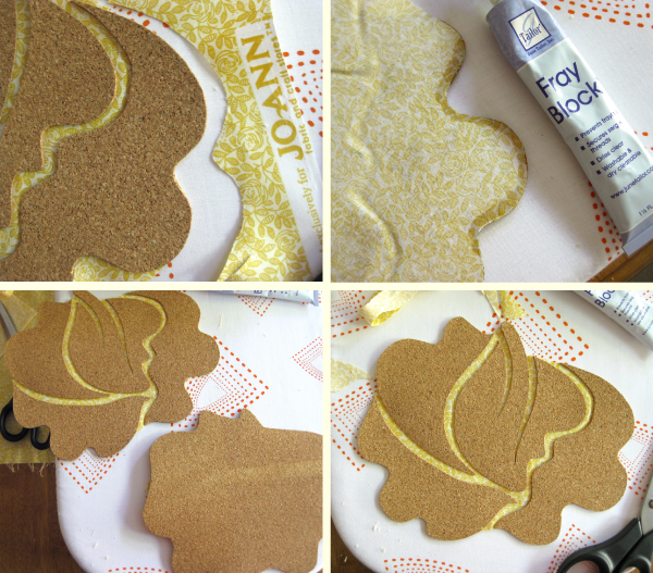 Once you have all the pieces glued in place, let it dry and then trim the fabric closely around the edges of the cork, following the shape of the piece in between pieces of cork. If you have some on hand or would like to, you can apply fray block or similar product to the edges of the fabric.