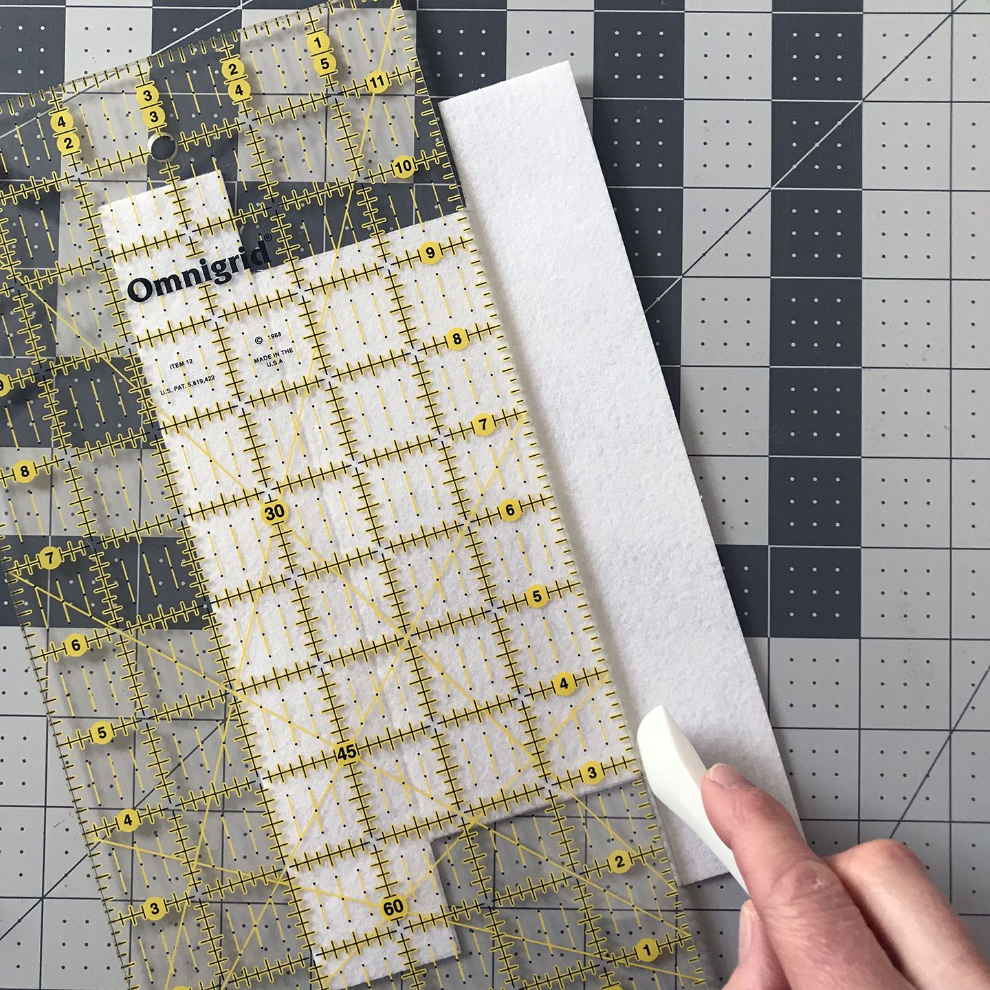 Once your Peltex piece is cut to shape according to the diagrams on page 5 of the pattern, you will first score along the dashed lines on the non-fusible side as indicated on the diagram. The fusible side will feel a bit textured, while the non fusible side will be smooth.