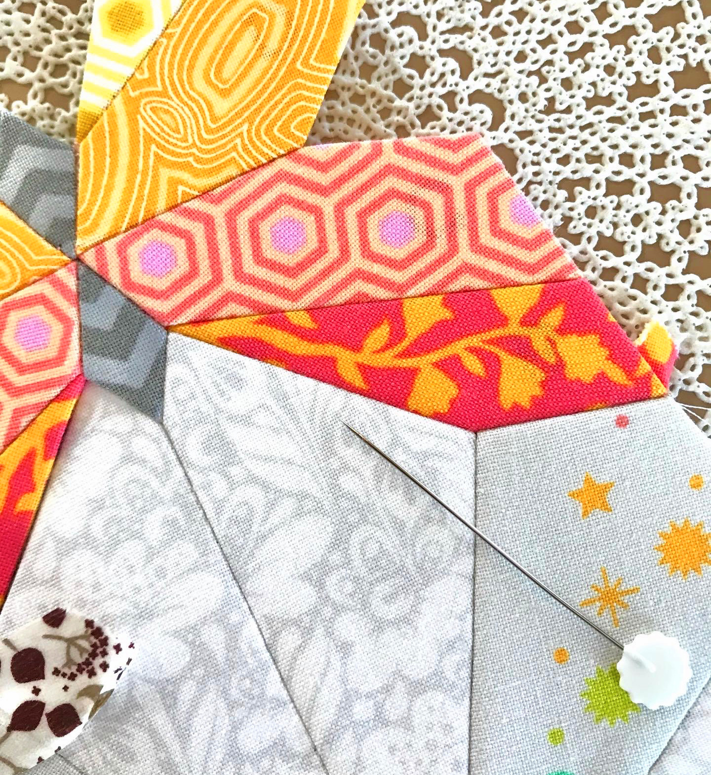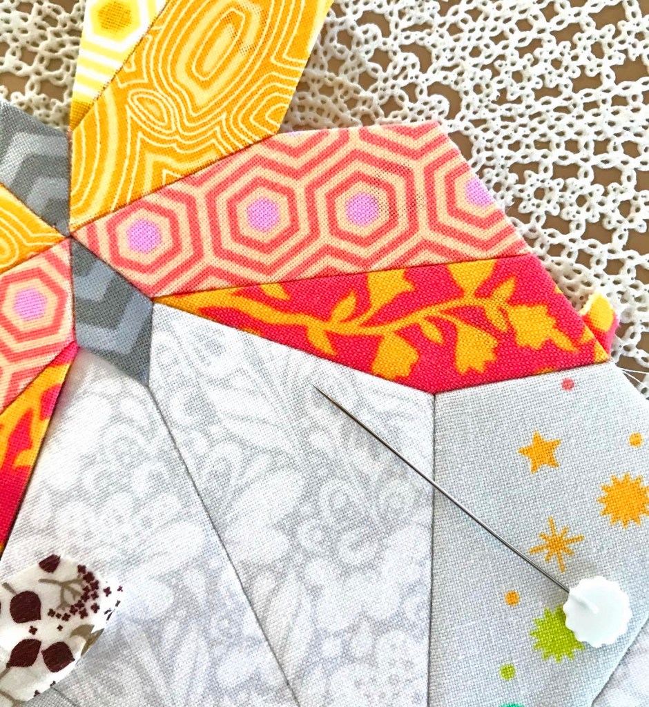 English Paper Piecing is a method of hand sewing where you stabilize your fabric on heavy paper (or cardstock) before sewing them together. The papers you use are cut to the exact size and shape as the pieces in the finished pattern and you cut your fabric 1/4″ (or 3/8″ at times) larger than your papers using templates. The extra 1/4″ of fabric wraps around your paper and becomes your seam allowance, just as you would have with traditionally pieced or hand sewn quilt blocks. Papers are essential to EPP and with this pattern you can either print your own or you can order supplies from Paper Pieces here. The pattern includes directions for how to print and cut your papers.