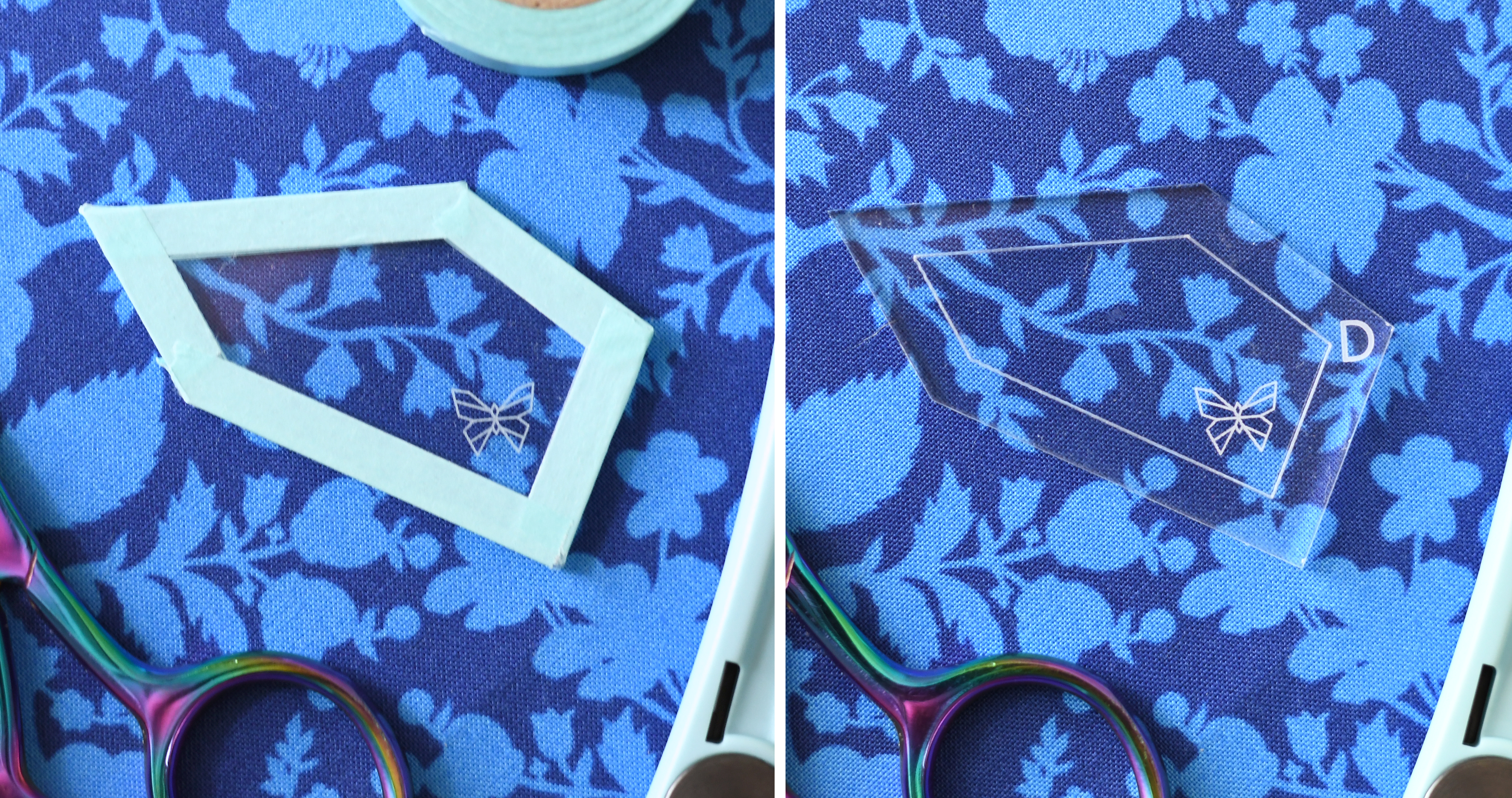 Everyone sees and processes patterns and information differently, so this may not be a useful tip to everyone, but just something that helps me! Keep in mind that with these templates, the washi tape will cover the template letter etched in the seam allowance, so you will want to draw it on the tape with a marker for reference, or if you have your templates stored in your lettered plastic bags then you’re good to go!