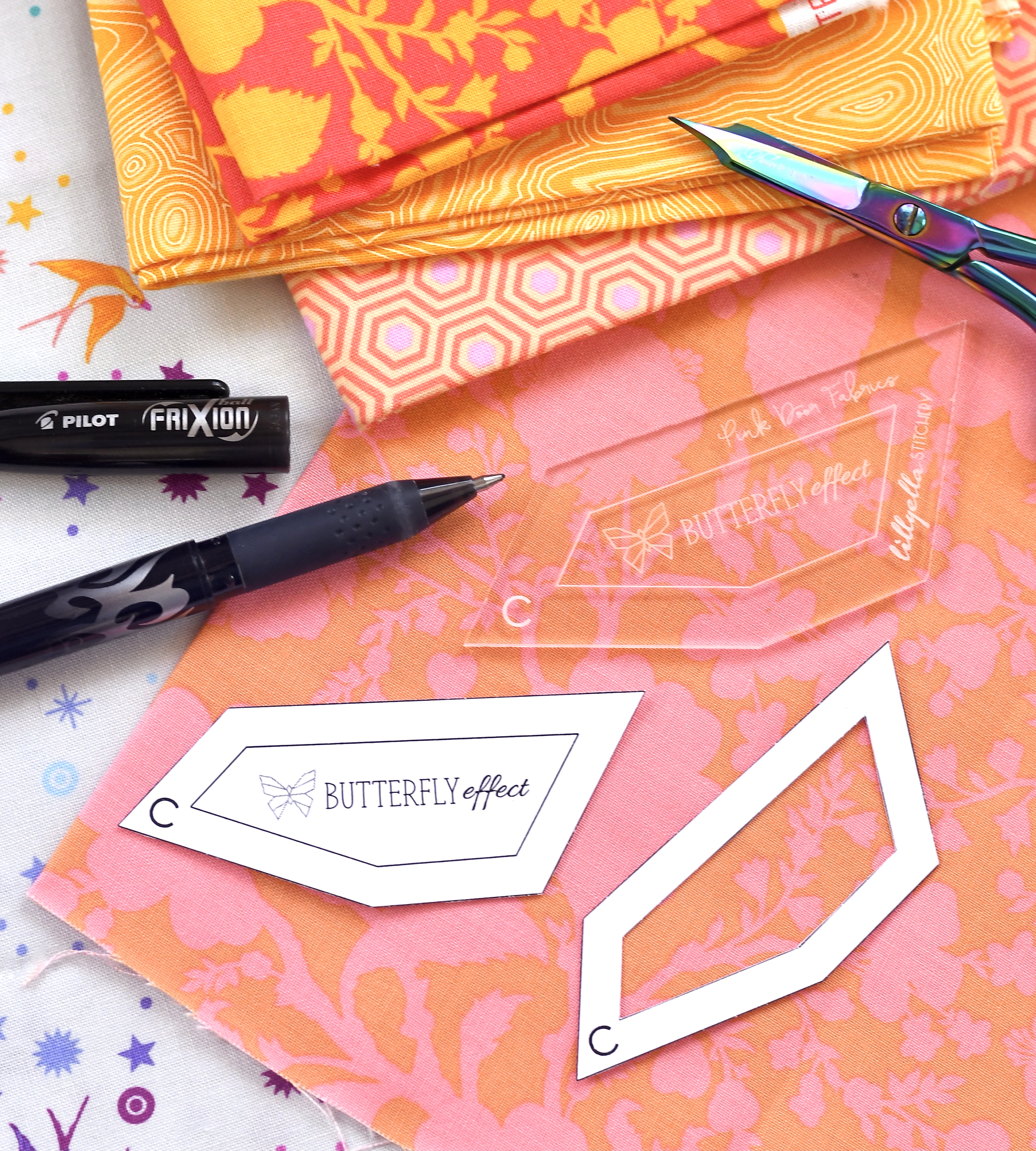 My Butterfly Effect pattern includes printable templates which are the white pieces you see above or you can order clear acrylic templates from Pink Door Fabrics, also shown above (UPDATE: Supplies are now available from PAPER PIECES HERE and you can select solid or windowed templates with a 3/8″ or 1/4″ seam allowance. I prefer 1/4″ for this project!). There are two options available for template sets from Pink Door. One includes a full set of templates for every piece of the pattern and the second is a mini set which includes acrylic templates for the butterfly and moth wings. You would then print and cut the other templates yourself. A third option is to trace the templates from the pattern file onto template plastic and cut them out.