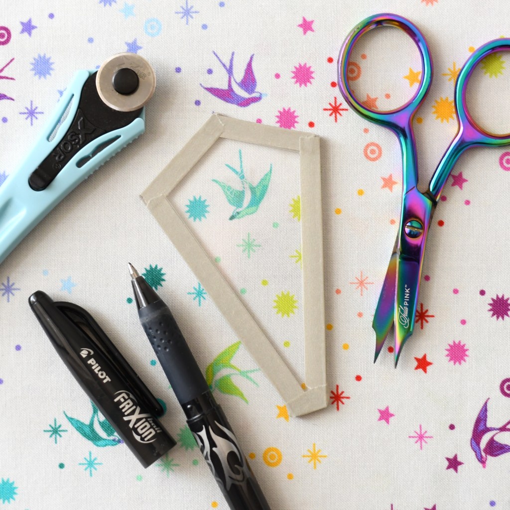 There are a couple options for tracing your template shapes and cutting your fabrics – you can trace and cut with scissors or you can use a small rotary cutter. If you are using templates that you printed onto cardstock, you will want to trace your templates and then cut them by hand. I always use a Pilot Frixion pen which erases with heat. This type of pen isn’t entirely necessary for this use since the traced edges will be hidden, but it’s just what I always have on hand and prefer to use just incase! If I trace some shapes and then change my mind, I can erase the lines away. I don’t recommend using a rotary cutter with paper templates (or template plastic) because you can easily cut into the template.