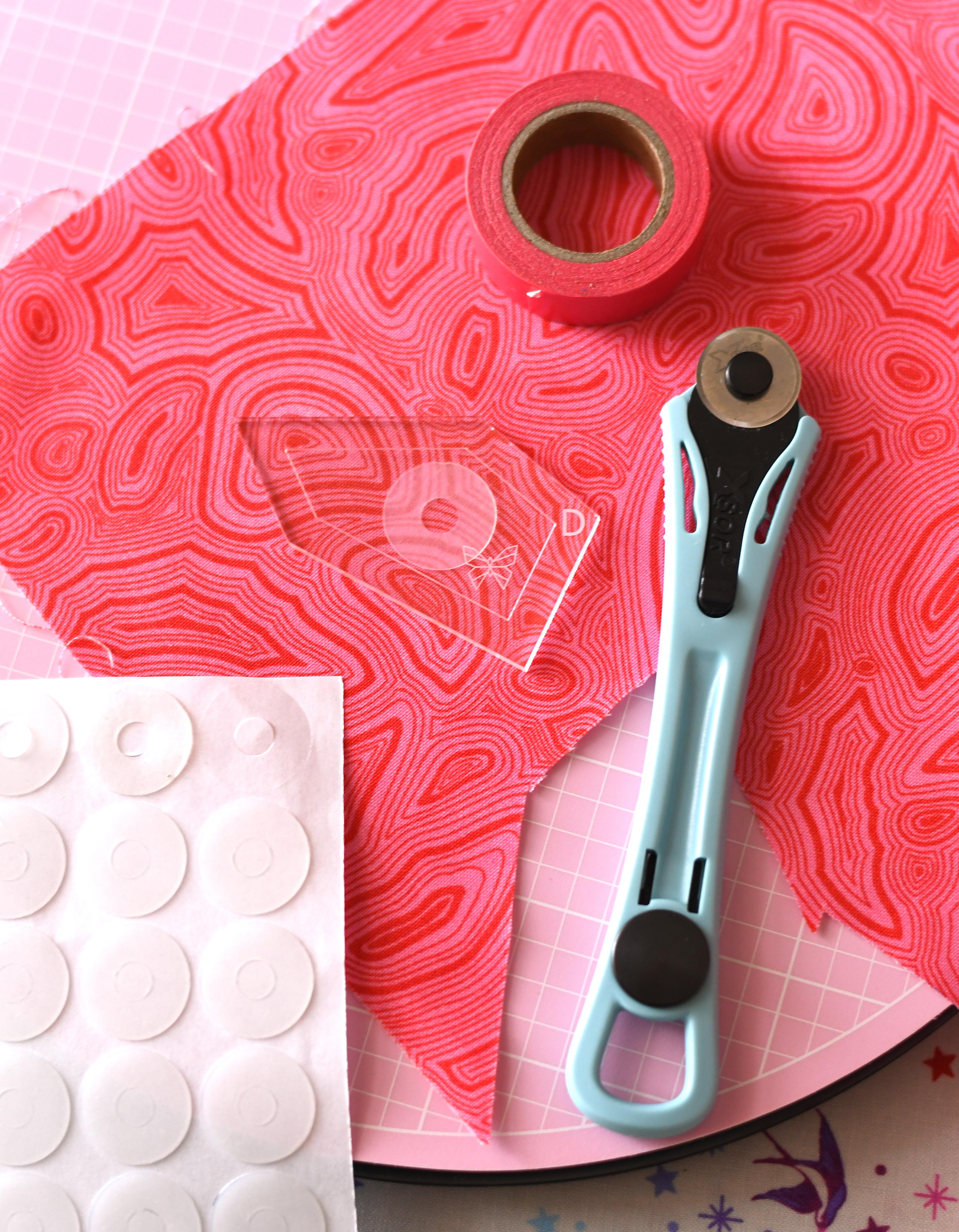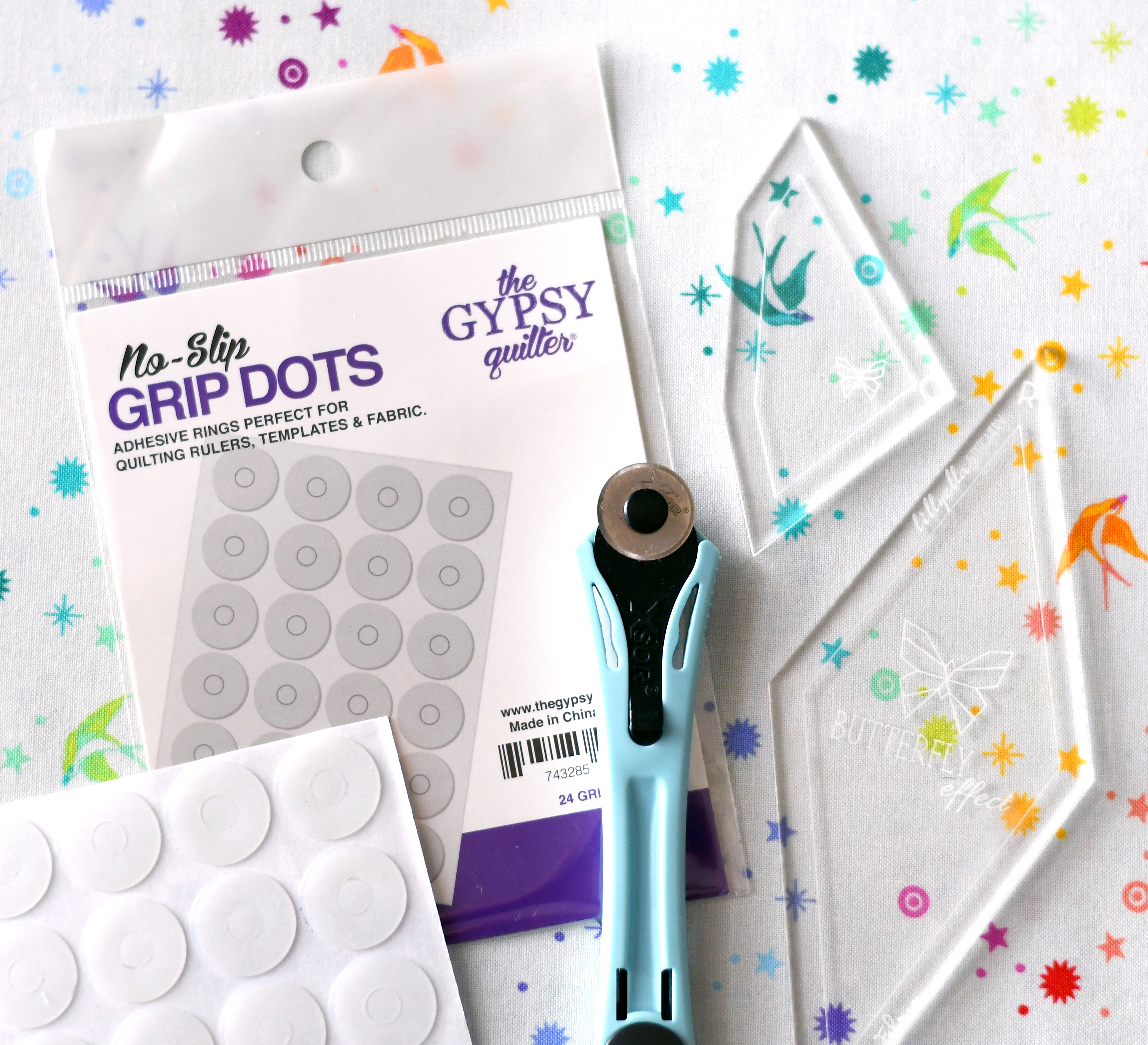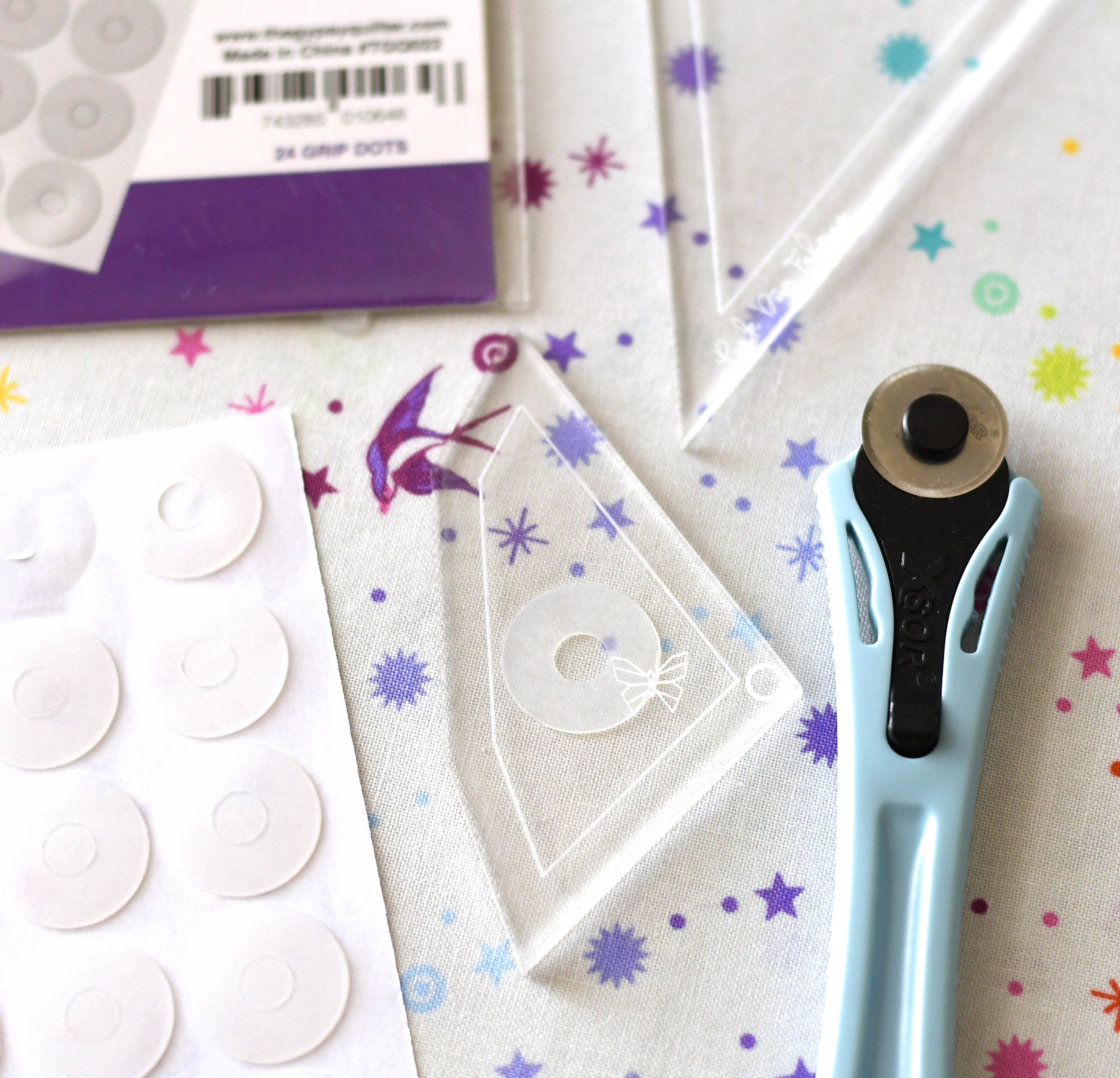 The acrylic templates can be quite slippery on top of fabric and even if you hold them down securely when cutting with the rotary cutter, I find that they can still shift around easily. The washi tape wrap does help with this a bit, but another tool that can help you are Grip Dots.