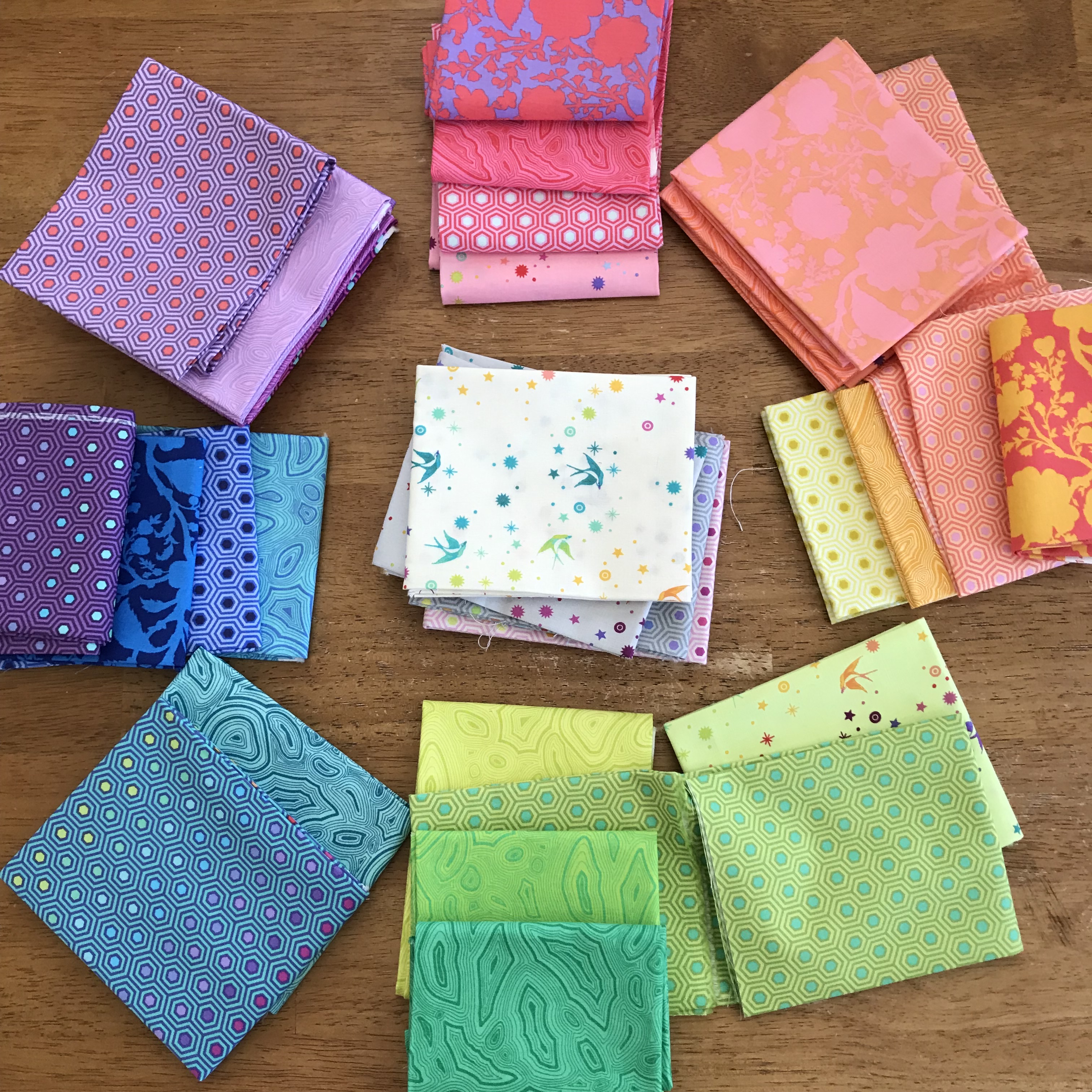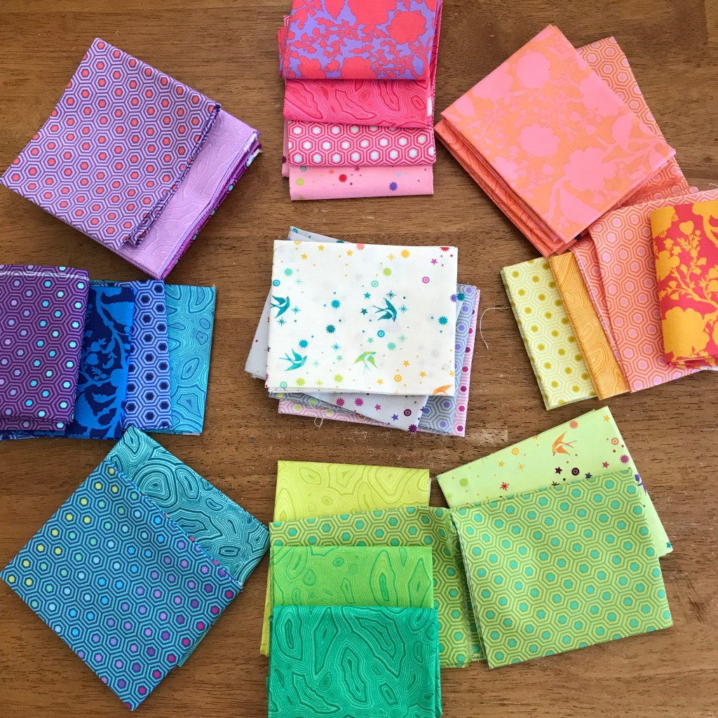 This bundle of Tula Pink True Colors showed up as I was finishing this pattern and I knew I had to use it. I played around with various combinations of a rainbow gradient and color placements for the butterflies and moths and then figured out how many different fabrics I would need to fit my color plan.