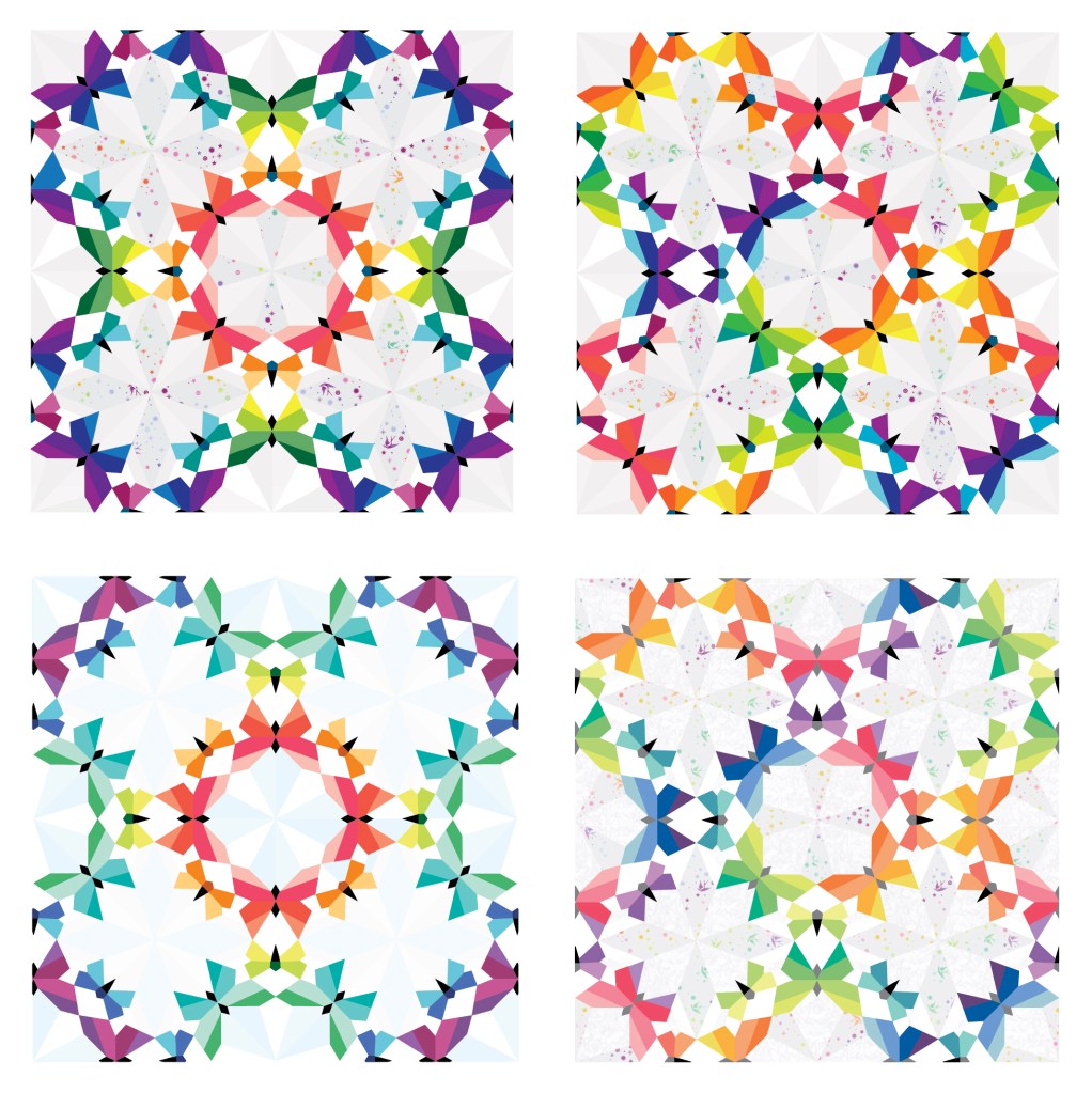 Here are some of the options I considered before deciding on the bottom right as the final for the pattern sample. I really loved them all and chose the one I did because I thought about different uses for this mini quilt and if making it into a pillow, I wanted there to be more even color distribution and was worried that the purple corners on the two left options would get lost wrapping around the edges of a pillow. I also loved the movement of the final version, it just keeps your eye fluttering around like butterflies do in nature.