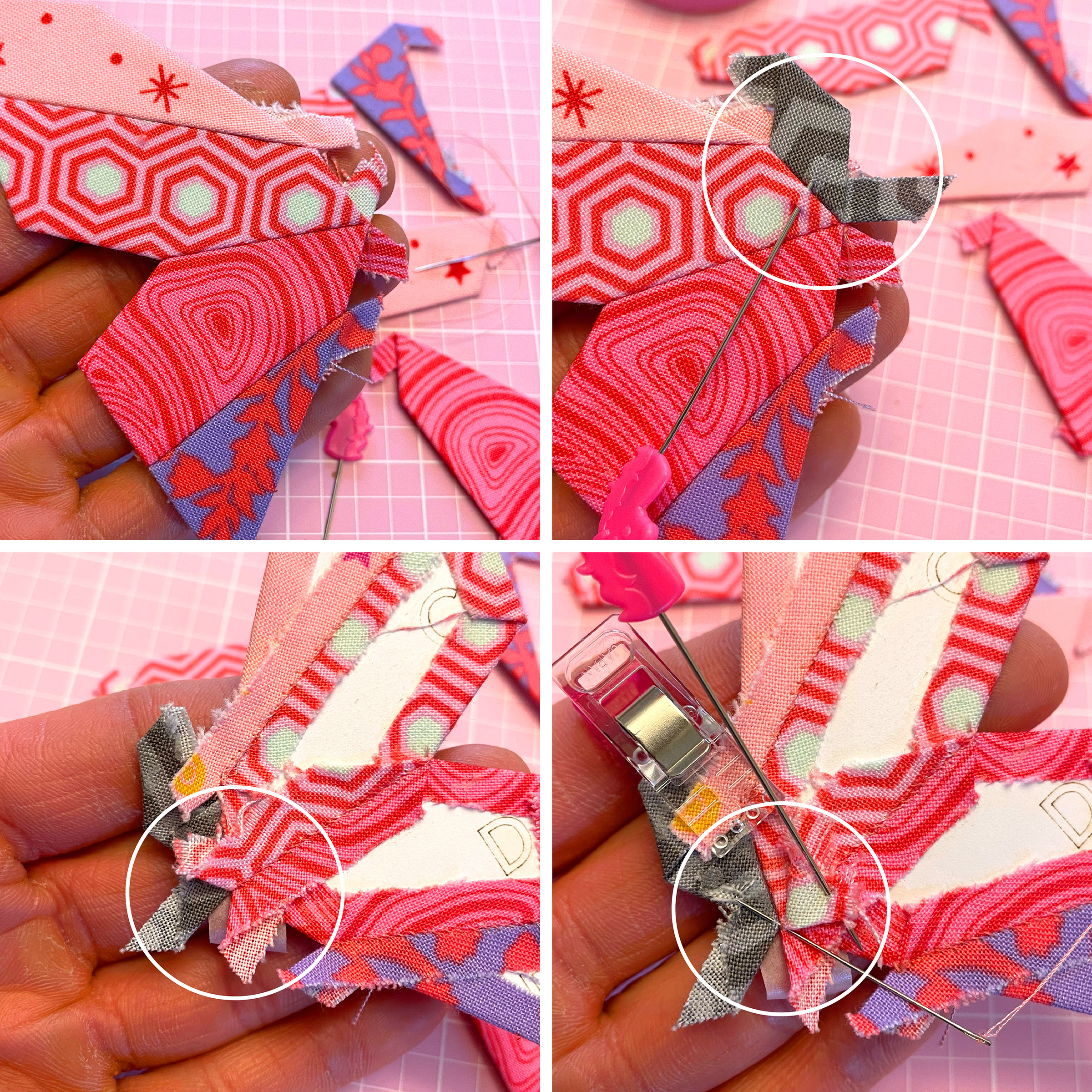 Above I am preparing to piece my D & E wing pieces together and you can see that I have a fold of fabric from my basting in the way of beginning my seam. This is something you will encounter often, especially when you begin joining more pieces. I use mini clover clips and/or straight pins to help temporarily move the fold out of my way.