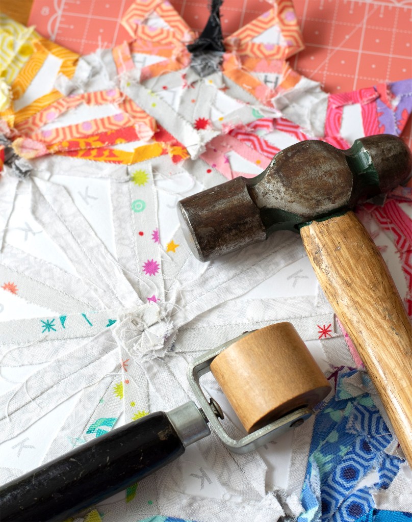 To help make these thick areas a little flatter, there are a couple tools you can use. One is a wooden roller and the second is a hammer! You can roll over the bulky areas with the wood roller or you can place a scrap of fabric or thin towel over them and gently hammer it. Both help compress and flatten the fabric a bit. This works for any type of project or bulky seam you’re working on.