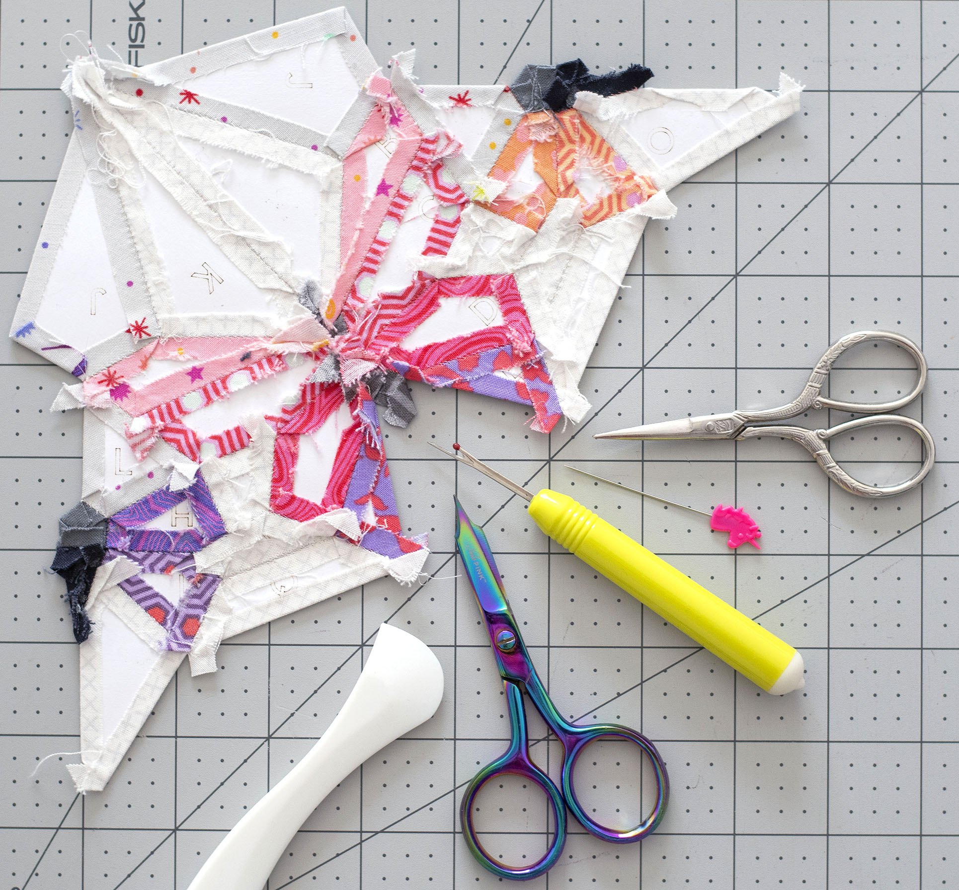 The papers remain in place while stitching your piece together and often until the entire piece is complete. I will talk about this in more detail during upcoming weeks. You will remove the papers after piecing by carefully lifting seams and releasing your basting (lifting glue or snipping stitches) with a small tool such as a seam ripper, tiny crochet hook, awl, purple thang etc. Sometimes people will punch a hole in their papers to have a place to insert a small tool and “pop” the papers out. I have never found this method to be especially helpful myself, especially with smaller pattern pieces such as those in Butterfly Effect. I typically use a seam ripper and make myself comfortable on the couch! If you have ever done Foundation Paper Piecing, it’s a similar process of removing your paper after you are done sewing.