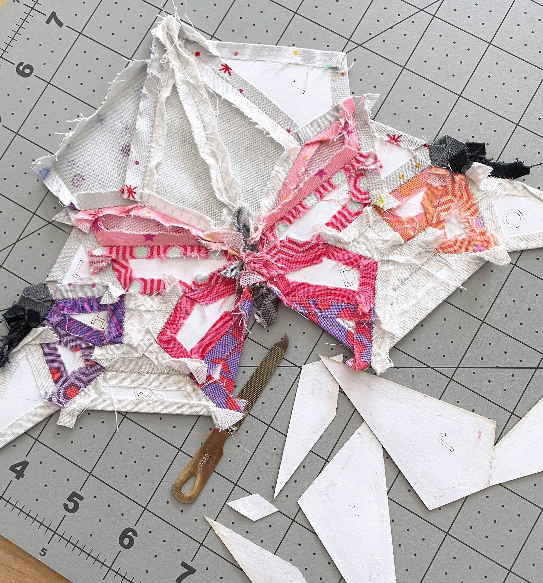 Hello friends! It’s time to wrap up the Butterfly Effect Sew Along and I want to thank you for patience with me in getting this last post up! I know many of you (including myself) are still sewing away on your piece and may be for some time, but today I’m sharing just a few short videos and some basic information about removing your basting papers and finishing your piece.