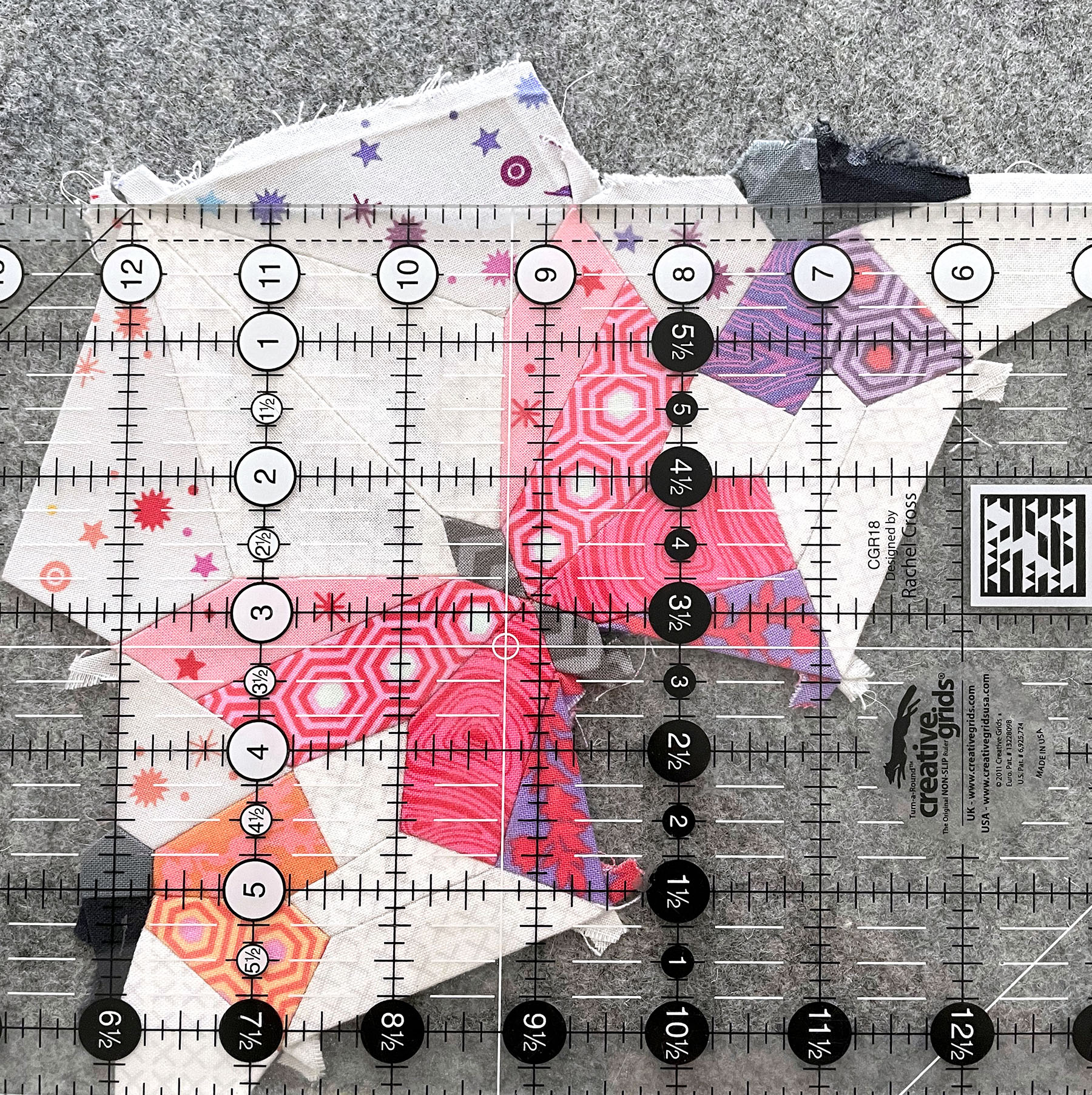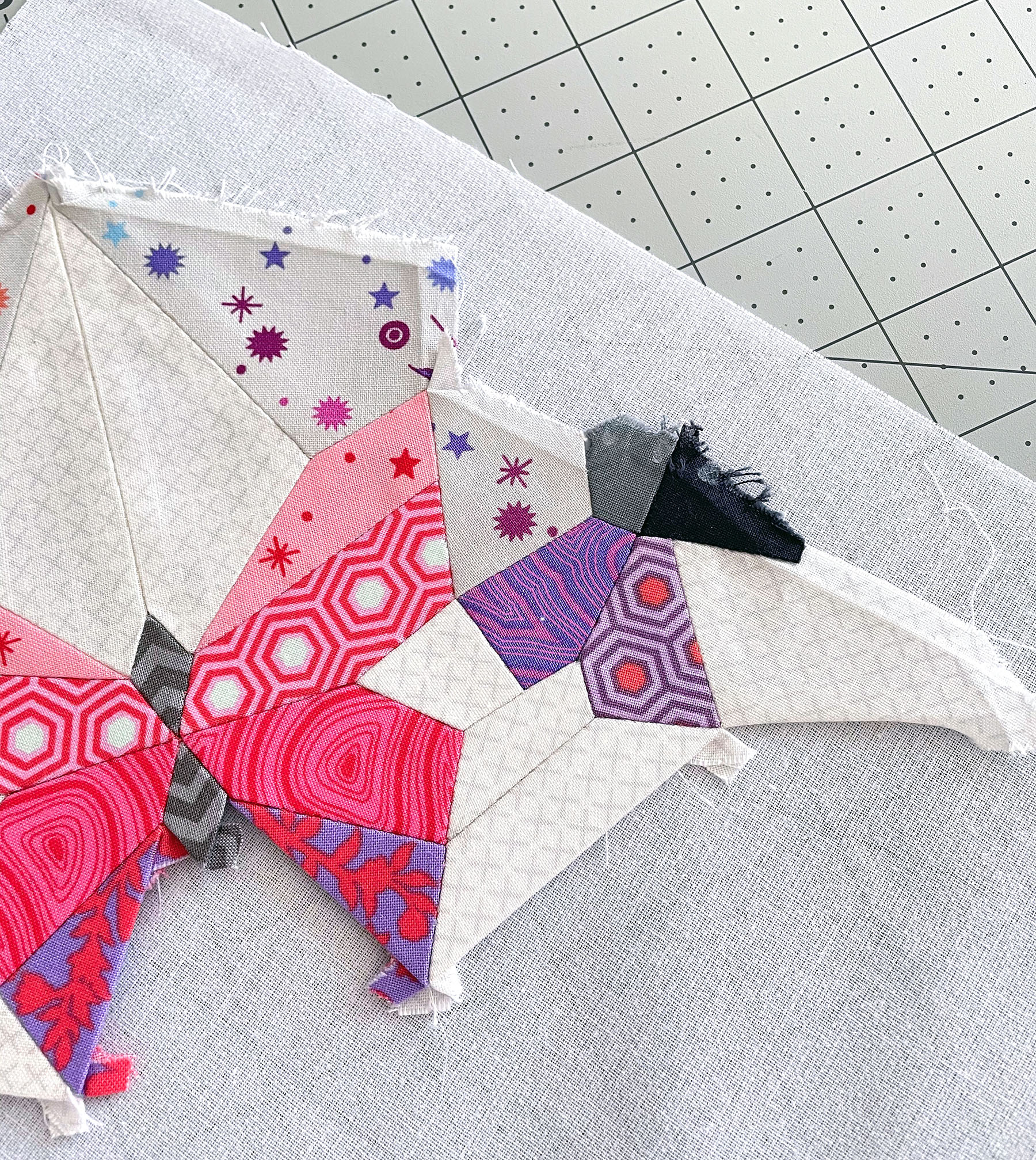 You need at least 1/4″ all the way around your piece for this purpose. With this pattern, you will have some uneven edges due to the shape of the pieces and this was discussed in the pattern. If you look along the top edge of the piece above, you can see I already pressed out my seams and have fabric extending beyond the edge of the ruler for my seam allowance. You can see the pieces that are “exact” and the pieces that are larger, like the moth bodies and corner star piece. If you look down the left edge of the piece above on the 12″ line, you will see I have not yet pressed these seams open and flat so I don’t have that 1/4″ seam allowance.