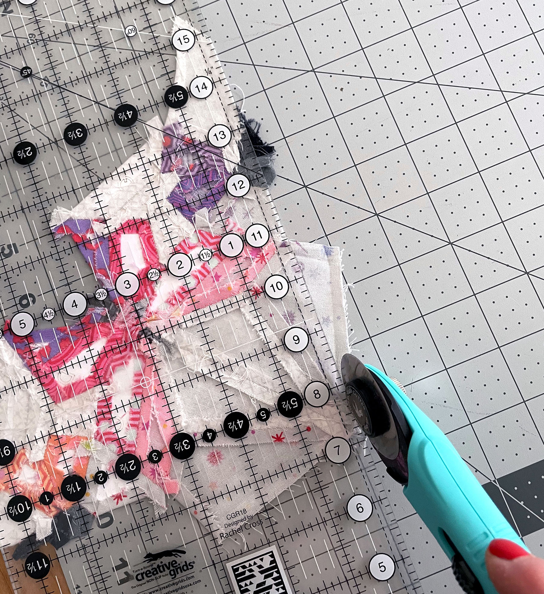 If you’d like a clean even 1/4″ seam allowance all the way around, use a quilter’s ruler and rotary cutter to trim your piece.