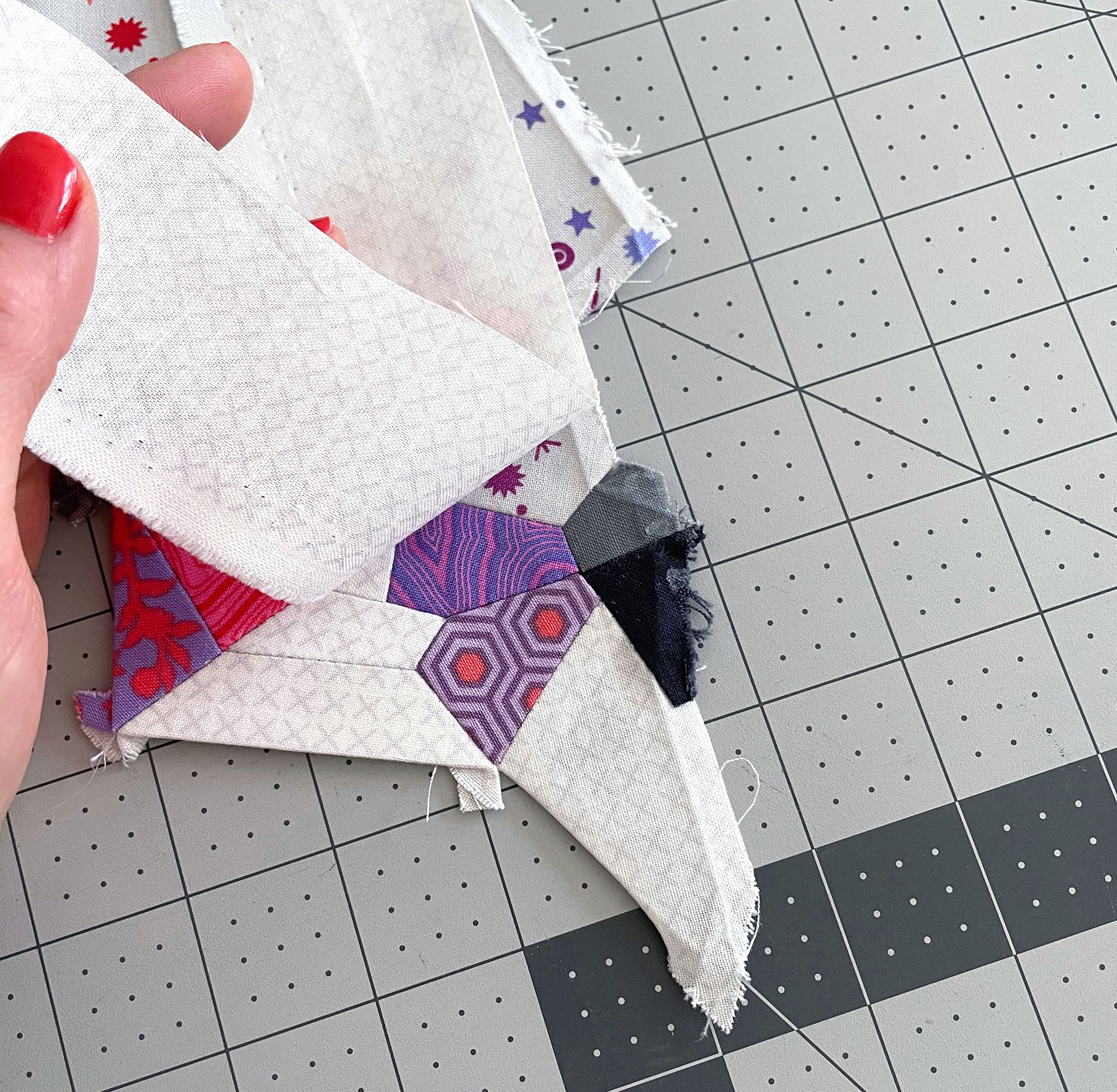 Another thing I usually do is leave a little “hole” in the middle, not stitching all the way to the ends of my points, but stopping just shy. This leaves a bit of play for things to fall in place when you adjust the bulk on the back (which I will talk about next). You can only see this hole when I move the seams out of the way on the back or I fold the piece in half which I’m doing in the photo above. If you look at the top photo of this post, you’ll see that you cannot see this little hole because it “fills in” when the piece lays flat.