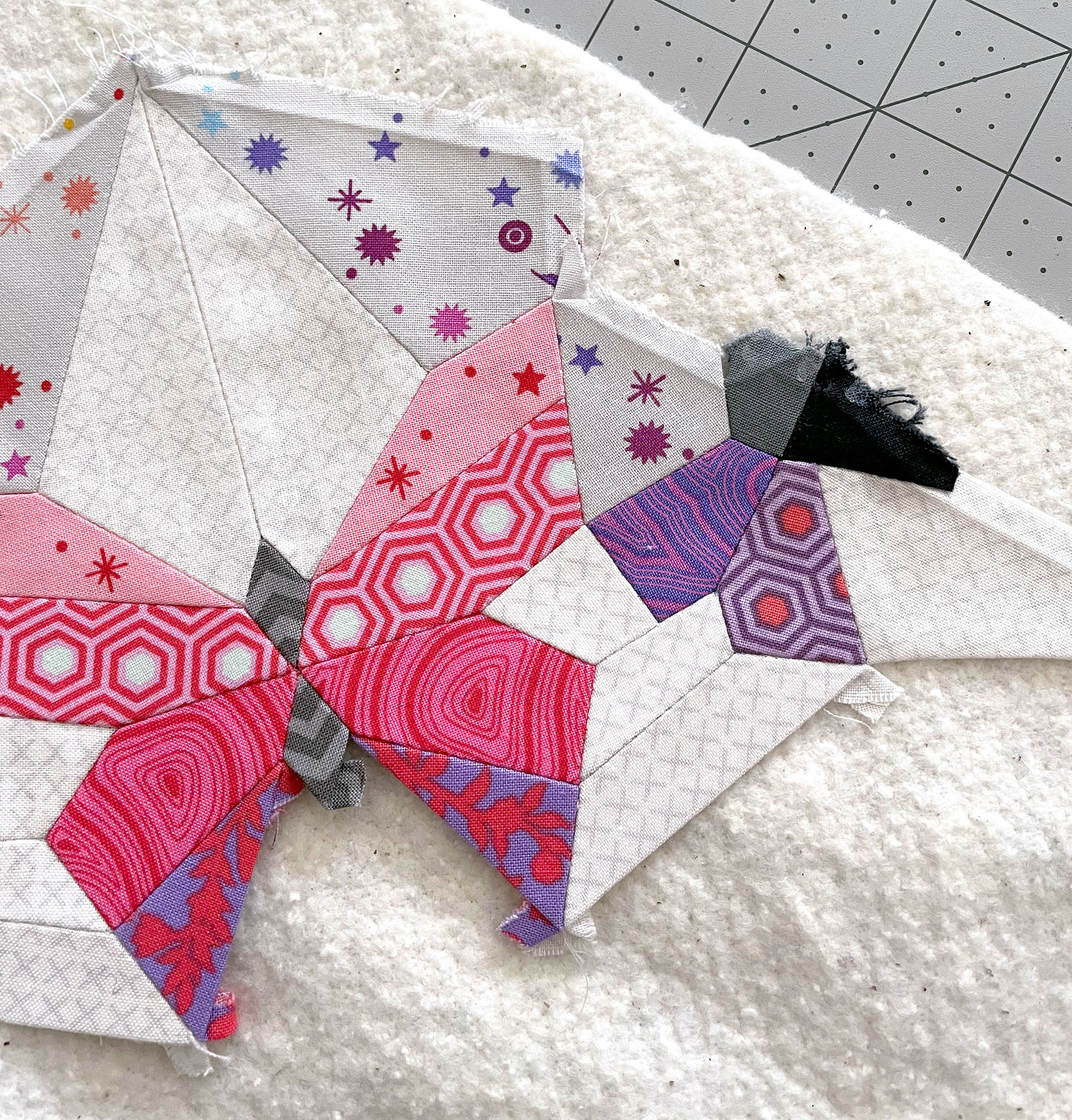 Hello again! It’s week three of the Butterfly Effect Sew Along and today I’m going to talk about stitching all our little bits together. In today’s post and video, I’ll be starting with a butterfly – joining two wing pieces together and growing from there. I then cover how I add the A body pieces, since they are the smallest and most fiddly!