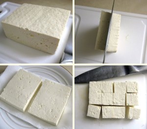 Once pressed, cut the tofu into 1″ cubes.