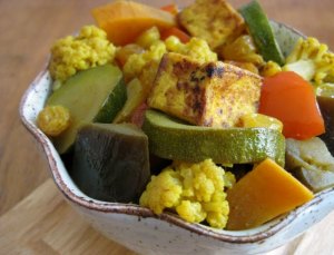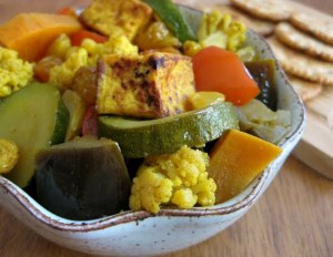 Next add the tofu, remaining vegetables, raisins, salt and pepper. Cover and simmer about 20 – 25 minutes, until the vegetables are tender but still hold their shape. Add additional seasonings to taste. You may find you like more salt than I call for, as I try to keep the salt fairly low in most of my dishes.