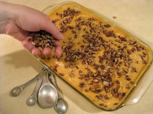 Next, toss the pecans in a bowl or plastic bag with 1 Tbsp brown sugar and 1/2 tsp cinnamon then spread them evenly over the pudding, if desired.
