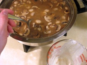 When the mushrooms are done, remove the meat and thicken the liquid to make a gravy. Mix about 3 Tablespoons flour with 1/2 cup water and add to the pan. Continue adding additional flour/water until the gravy is as thick as you’d like. Add pepper to taste, and salt if you wish, but the bouillon has enough salt to last you a lifetime! This is definitely not for those on a low-sodium diet 🙂
