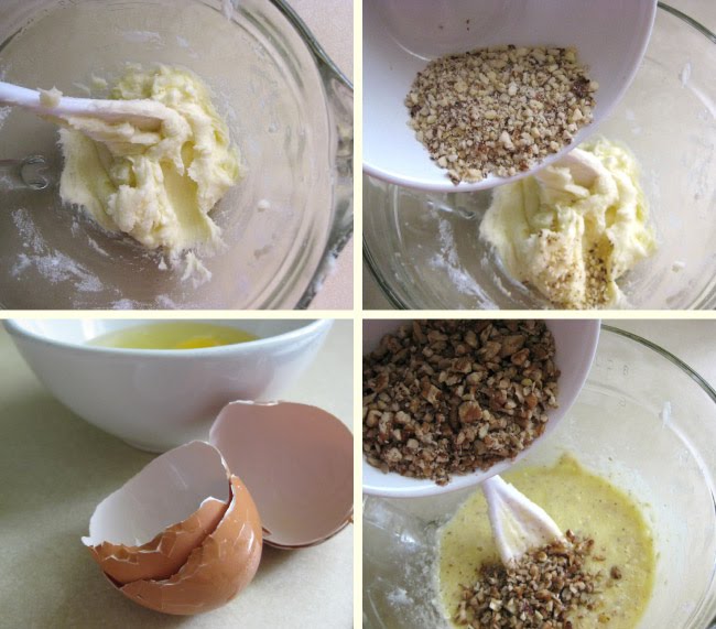 Beat the butter and sugar together until light and fluffy. Stir in the ground almonds then slowly beat in the eggs. Next stir in the chopped pecans.