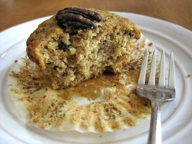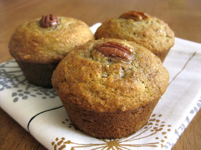 Divide the batter into prepared cups, filling about 2/3 full. These muffins will rise quite a bit, so be sure not to overfill. Top each muffin with a pecan half and bake for 20 minutes, or until risen and firm to the touch.