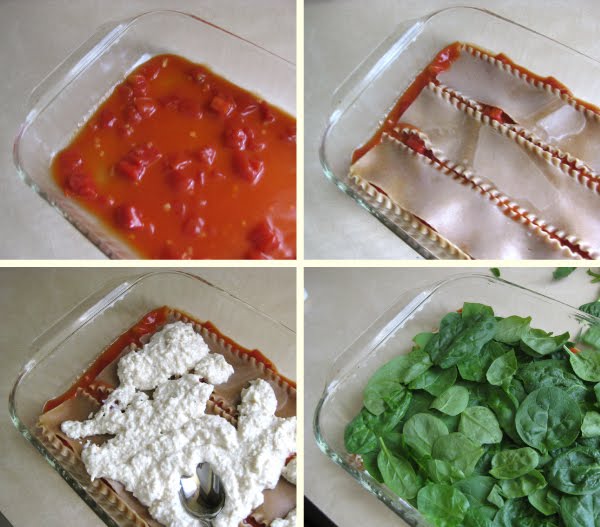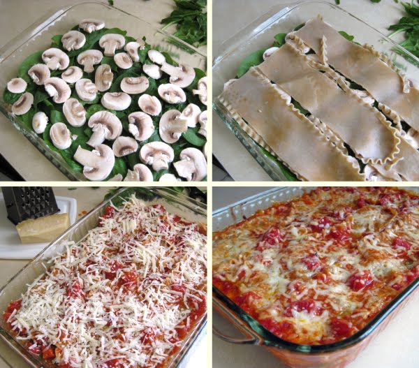 To assemble the lasagna, spread about 1 cup of sauce in the bottom of the prepared baking dish. Lay three sheets of pasta in the dish, leaving a bit of space around each one. Spread the tofu mixture evenly over the noodles then top with a layer of spinach and a layer of mushrooms.