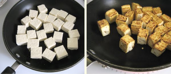 Coat a large skillet with cooking spray and fry the tofu on medium high heat until crisp and browned on all sides, about 2 – 5 minutes per side. Set aside.