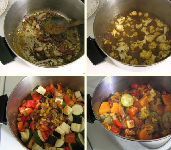 Next add the tofu, remaining vegetables, raisins, salt and pepper. Cover and simmer about 20 – 25 minutes, until the vegetables are tender but still hold their shape. Add additional seasonings to taste. You may find you like more salt than I call for, as I try to keep the salt fairly low in most of my dishes.