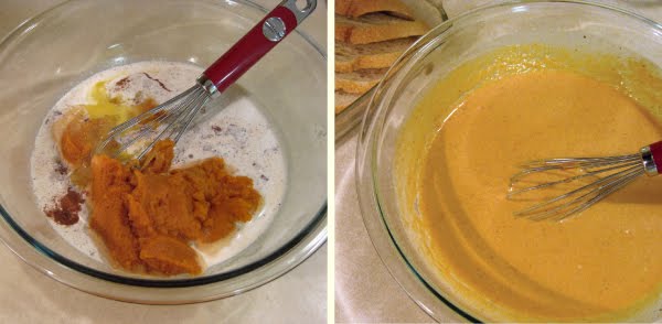 To make the custard, whisk all the wet ingredients and spices together in a large bowl then pour the custard over the bread in the baking dish. Be sure to stir it around or lift the slices to spread it in between and under, making sure all the bread is thoroughly coated.