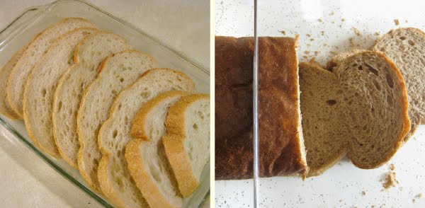 You shouldn’t need more than 10 oz of bread, maybe less depending on what kind and the shape you use, you’ll just want to fill your pan nicely. You can either use 1/2″ slices as shown on the left (quick and easy!) or you can cut or tear 1″ cubes from an unsliced loaf and scatter them in your pan.