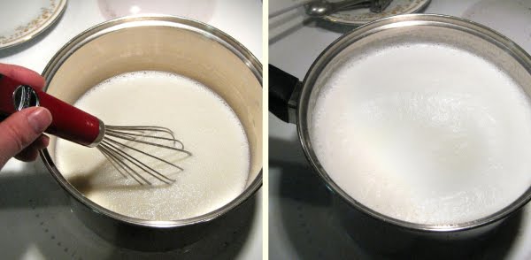 In a large saucepan, whisk together the milk, sugar and salt and heat to a simmer over medium heat.