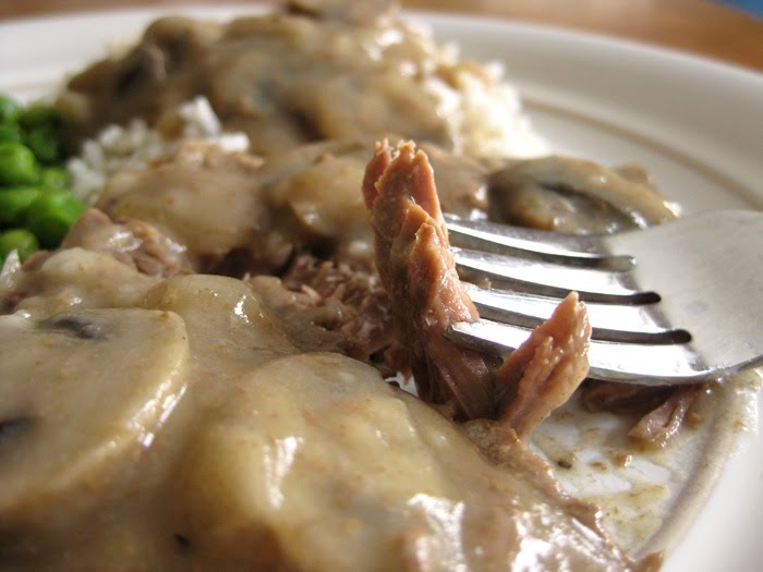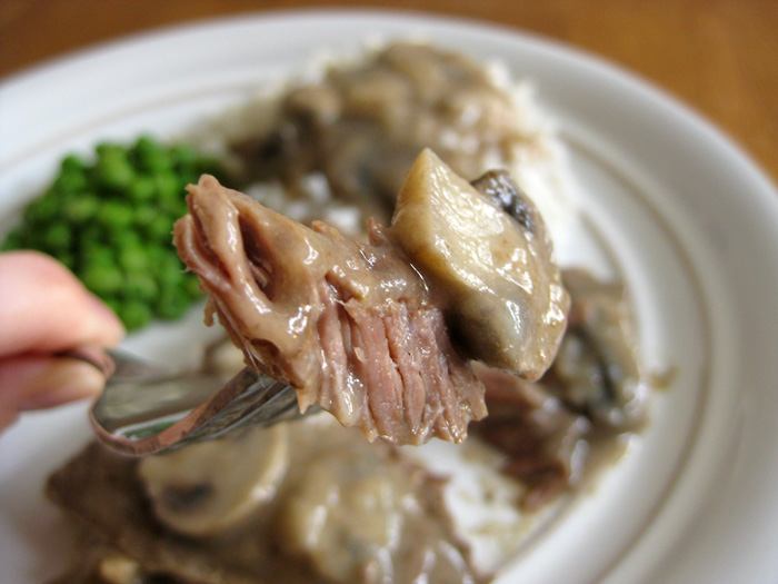When the mushrooms are done, remove the meat and thicken the liquid to make a gravy. Mix about 3 Tablespoons flour with 1/2 cup water and add to the pan. Continue adding additional flour/water until the gravy is as thick as you’d like. Add pepper to taste, and salt if you wish, but the bouillon has enough salt to last you a lifetime! This is definitely not for those on a low-sodium diet 🙂