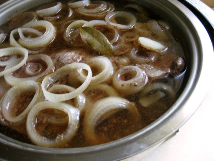 In an electric skillet (we swear by a 30 year old Lifetime brand one), place the raw beef, sliced onion, bouillon cubes and one bay leaf (if desired). Add enough water to just cover the meat and simmer, covered, for about 4 – 5 hours or until the meat is cooked to your liking. By the way, don’t be scared of the onions if you’re usually not a fan. They cook away into nothing but flavor which isn’t oniony and gross, but essential and delicious!