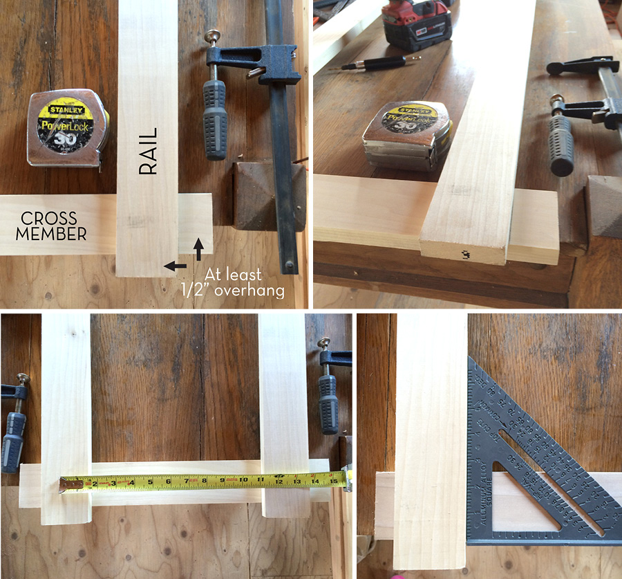Next you will lay one rail length perpendicular on top using your square to make sure it is squared up. Draw a pencil line along both the left and right edges of the rail piece onto the cross member below. You can now use a clamp, if you have them, to keep this piece in place.