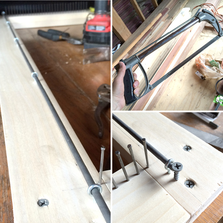 Your round bar will need to be cut to size. First place your end screws on one cross member (predrill then screw into place, leaving enough screw exposed so the head sits just above the screw eye), then slide your steel round bar through the eye holes and mark the length you need to cut your round bar where you will place the holding screws on the other cross member. A sharpie works good for this. Slide your round bar out and cut it to size using a metal hack saw.