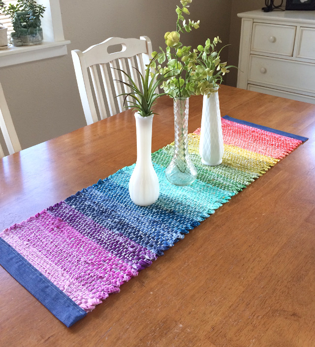I’m calling it Rip Strip Weaving because I used torn strips of cotton fabric, but the possibilities of what you can create with this loom are endless. I used 2″ strips, but plan to make my next one using a variety of widths and materials to get a very scrappy look. You can use strips of any lighter weight material for this project β cotton, knit, denim, rayon, sheer fabrics, you name it. You can also weave with yarn, twine or ribbon and in beads or any other decorations you like. I will be using a mix of all those things on my next runner. I finished the above runner with denim cuffs, but will be adding fringe tassels on the next.