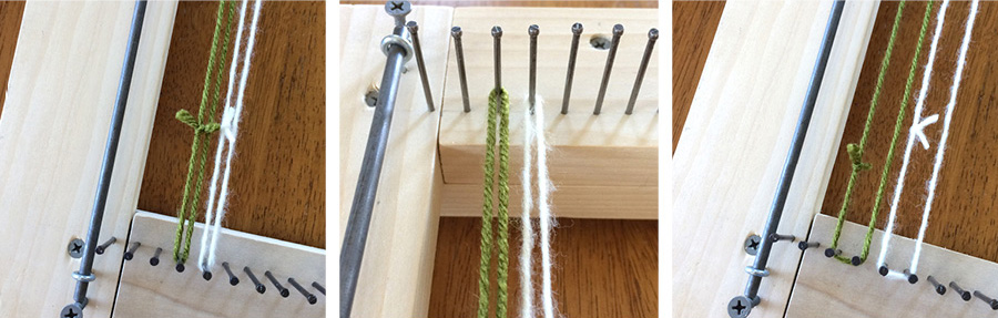 Repeat these steps to place your nail posts on the other cross member. The next step is to place your anchor rods. These keep your woven piece square and prevent it from pulling in on the sides as you get to the middle of the piece.