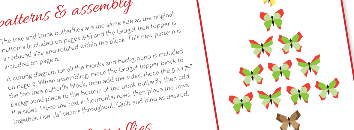 This festive mini quilt measures 22” x 26” and features my Butterfly Charm Block patterns with a little Gidget tree topper. It’s perfect for hanging on a door or anywhere you don’t have room for a real tree!