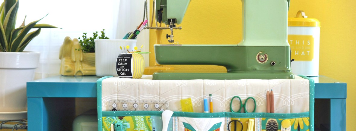 This dual purpose sewing space organizer has double pockets and a removable thread catcher to keep all your notions at hand and your workspace tidy. It goes from under to {machine} cover when not in use with side ties to keep it in place.